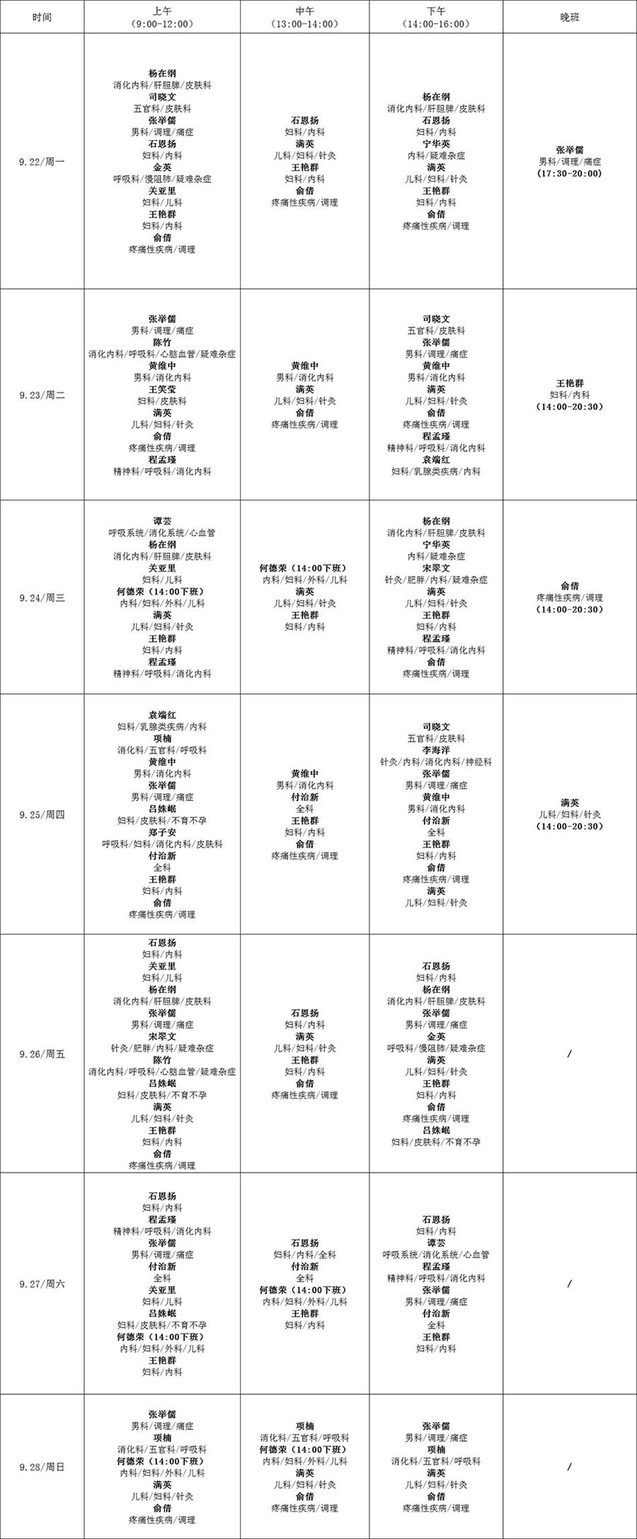 2025年9月22日-9月28日同济堂中医院专家出诊时间表