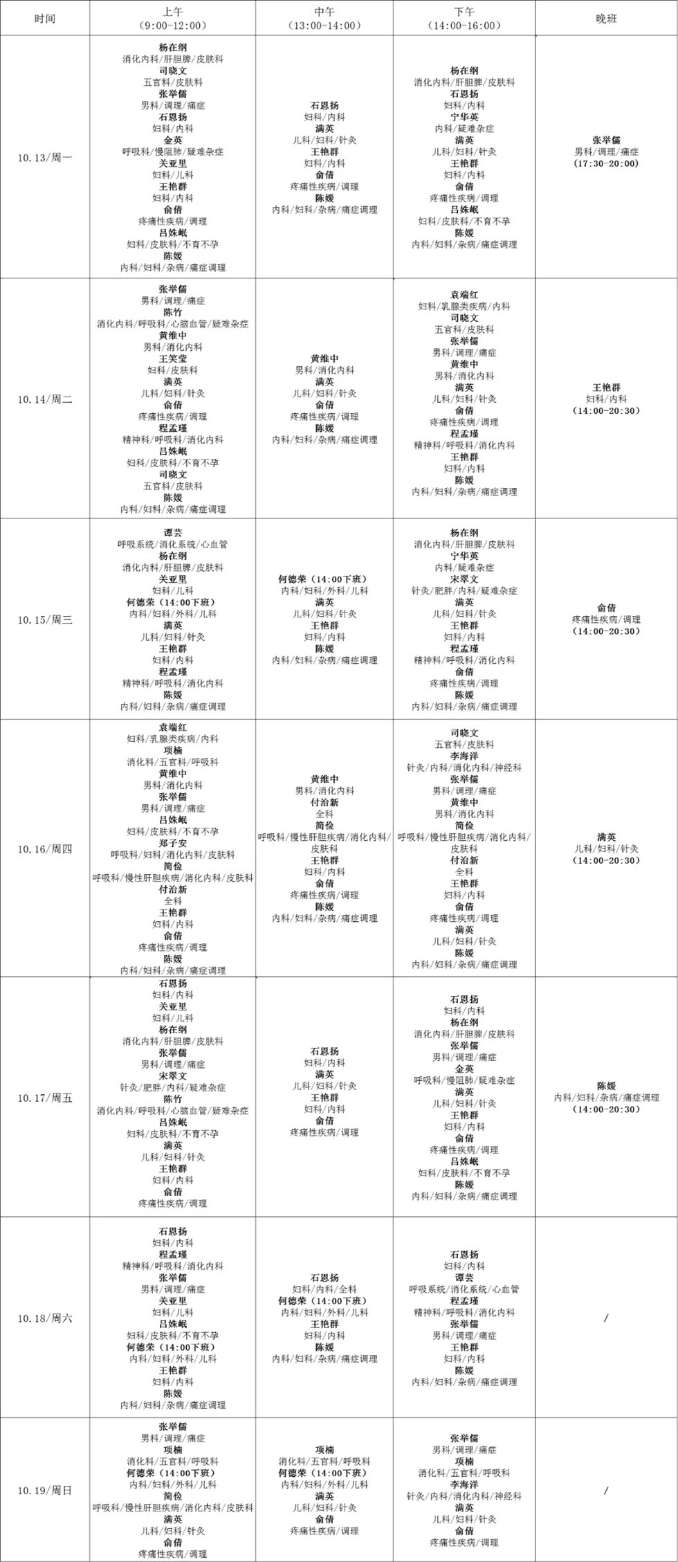 2025年10月13日-10月19日同济堂中医院专家出诊时间表