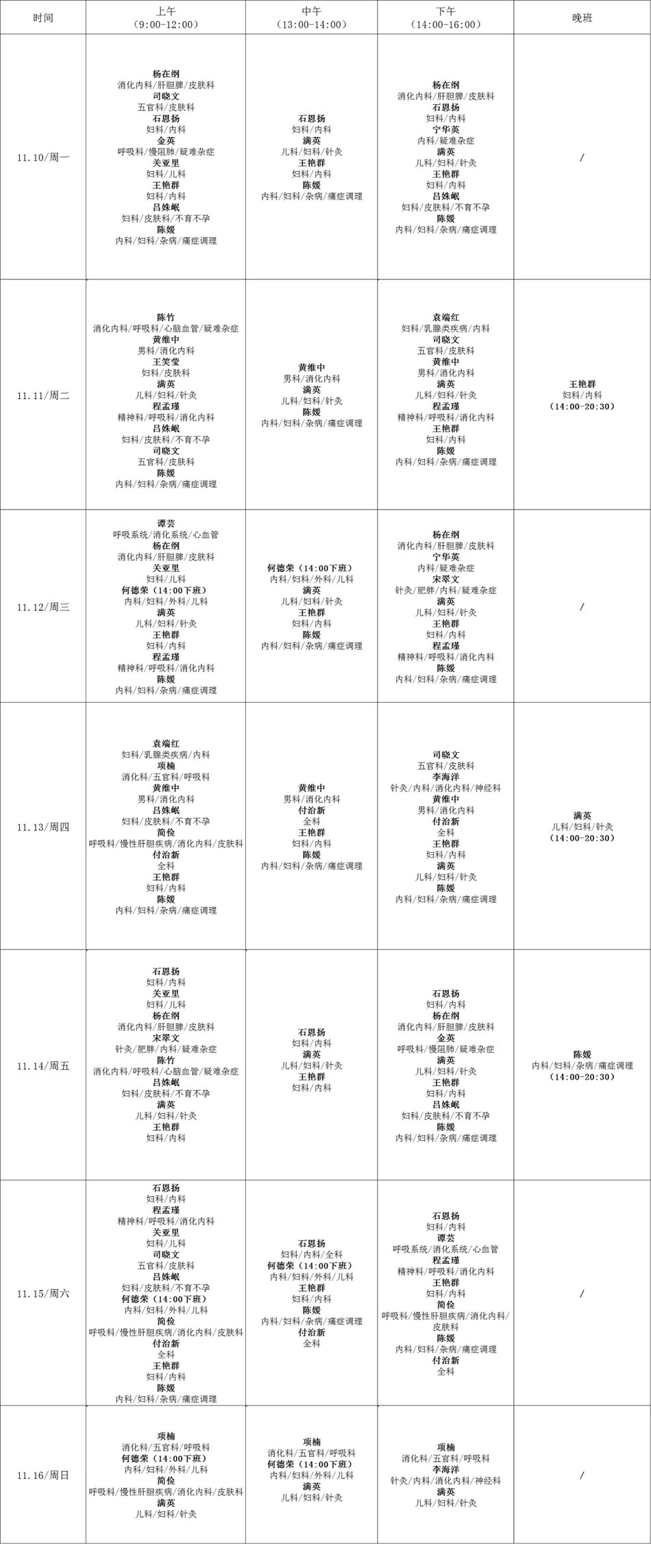 2025年11月10日-11月16日专家出诊时间表