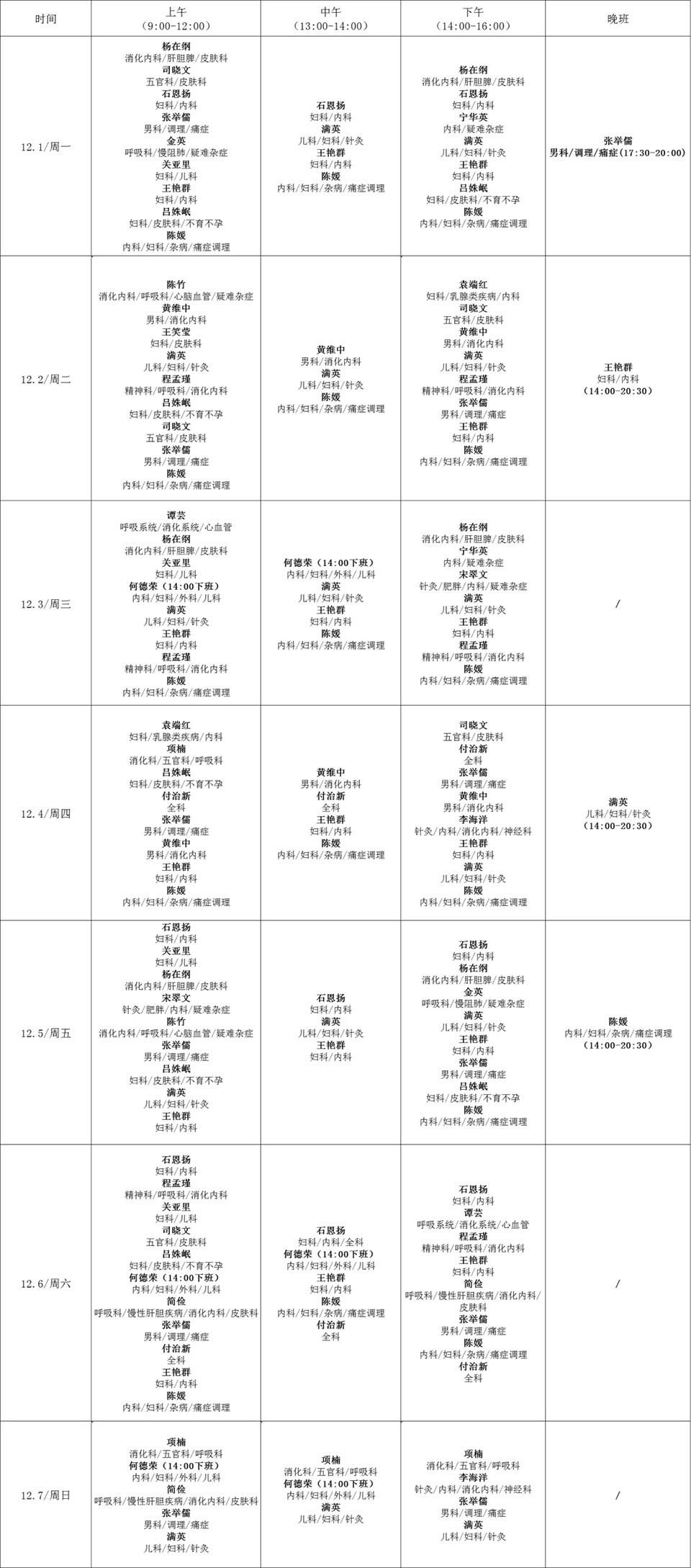 2025年12月1日-12月7日专家出诊时间表