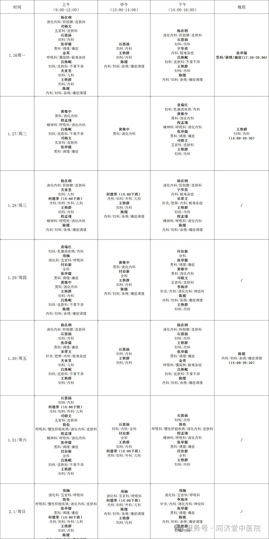2026年1月26日-2月1日同济堂中医院专家出诊时间表