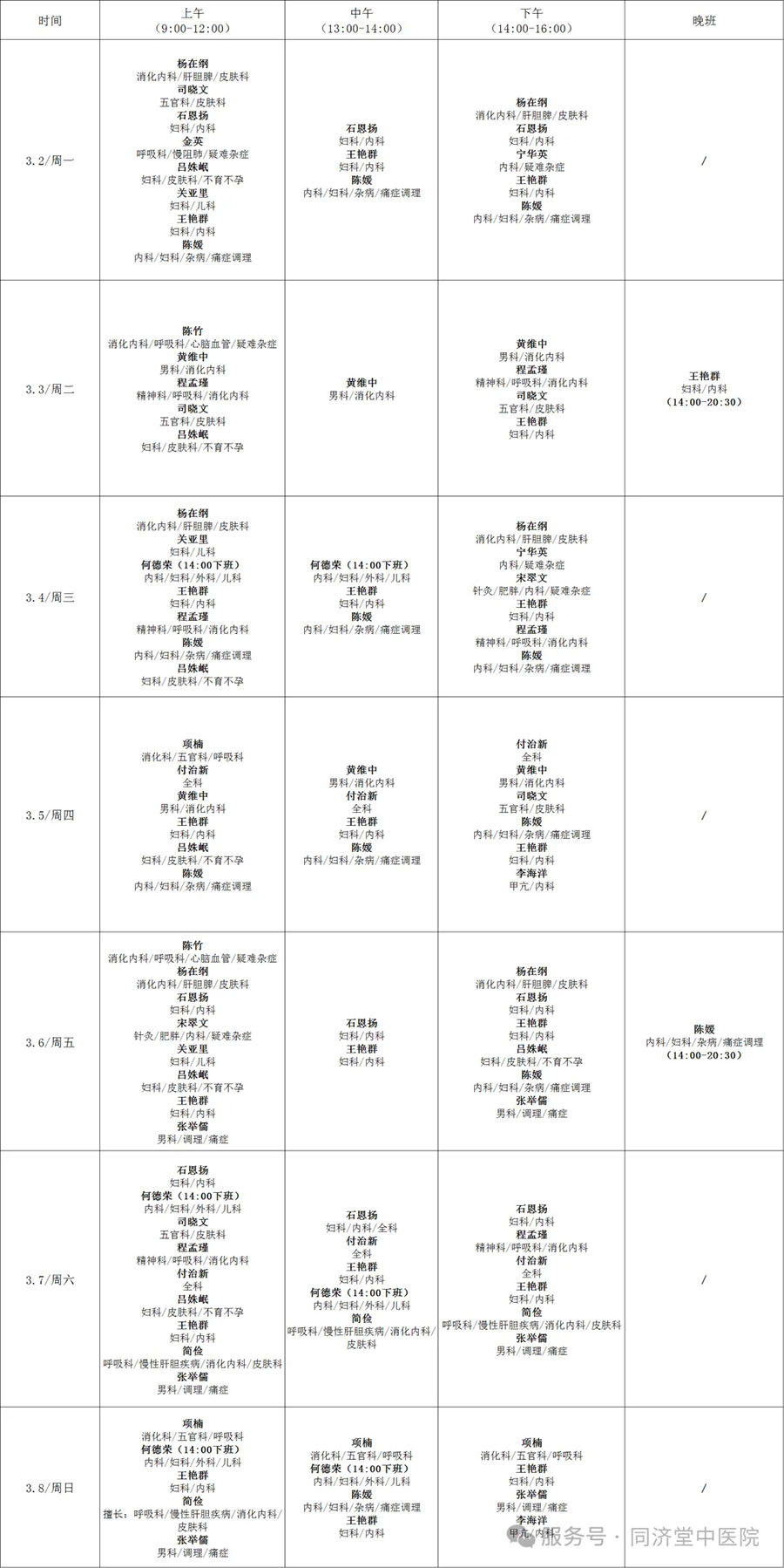 2026年3月2日—8日同济堂中医院专家出诊时间表